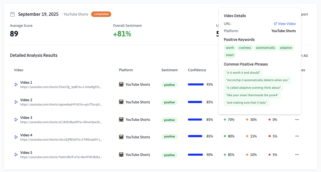 Use Case Example: We used SocialScouter to listen to the top five Youtube Shorts that showed up when we searched “Pura Diffuser Reviews.” It was obvious at the start that their customers loved their products, and fragrances, but with our Phrase Analysis we could see why they were positive. Repeated phrases that kept appearing where about the “Automatic” features with fragrance detection and also setting your Pura diffuser on a schedule.